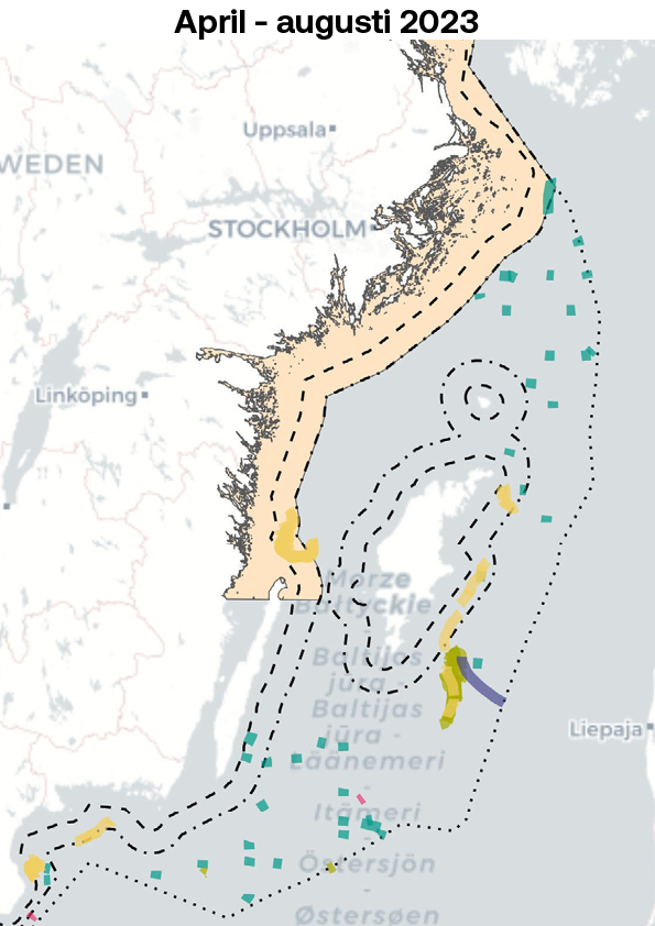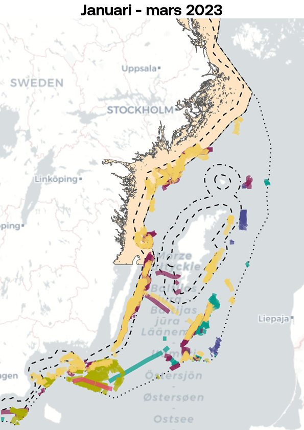 Den data från 2023 som BalticWaters har begärt ut från Sjöfartsverket visar var fiskebåtar över 24 meter har trålfiskat mellan olika tidsperioder. Datan visar att dessa båtar var mycket mer aktiva mellan januari och mars än under perioden april till augusti. Ett förbud mot fiske för att freda fiskpopulationerna bör därför placeras under årets första månader för att ge önskvärd effekt. Kartorna nedan visar delar av centrala Östersjön.