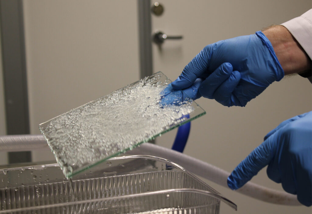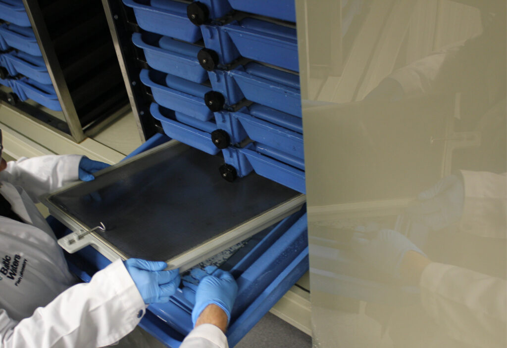 Efter en stund plockar forskarna upp glasplattorna med de klibbiga äggen och placerar dem i olika fack i inkubatorn, som hela tiden förser äggen med friskt, cirkulerande vatten.